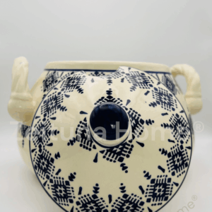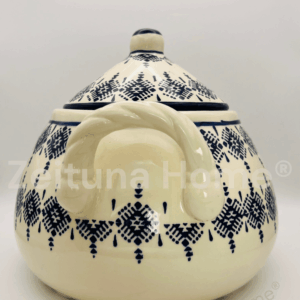 إناء مصنوع يدوياً ومطلي يدوياً بتصاميم بربرية زرقاء تقليدية مستوحاة من جبال جرجرة—سلسلة جبال جميلة في شمال الجزائر تشتهر بقممها العالية وثقافتها الغنية. إناء جرجرة يجمع بين الجمال والأناقة والعملية. المقابض مصممة للاستخدام السهل، والغطاء يساعد في الحفاظ على حساءك أو شوربتك أو حريرتك دافئة وجاهزة للتقديم. سواء كنت تبحث عن هدية مميزة أو ترغب في رفع مستوى تجربتك في تناول الطعام، فإن هذا الإناء من جرجرة، المتجذر في التقاليد، هو خيار ممتاز.
